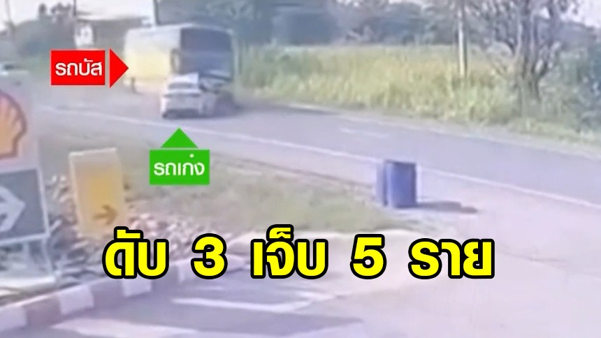 เก๋งวิ่งข้ามเลน ประสานงารถบัสรับส่งพนักงาน จนรถพังยับ ตาย 3 เจ็บ 5 ราย