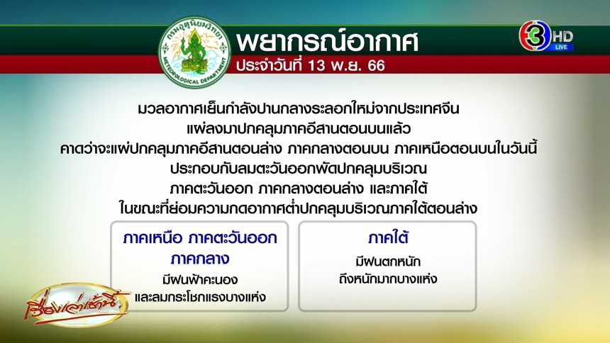 พยากรณ์อากาศ 24 ชั่วโมงข้างหน้า 13 พฤศจิกายน 2566 บริเวณความกดอากาศสูงหรือมวลอากาศเย็นกำลังปานกลางระลอกใหม่จากประเทศจีน แผ่ลงมาปกคลุมภาคตะวันออกเฉียงเหนือตอนบนแล้ว คาดว่าจะแผ่ปกคลุมภาคตะวันออกเฉียงเหนือตอนล่าง ภาคกลางตอนบน และภาคเหนือตอนบนในวันนี้ (13 พ.ย. 2566)