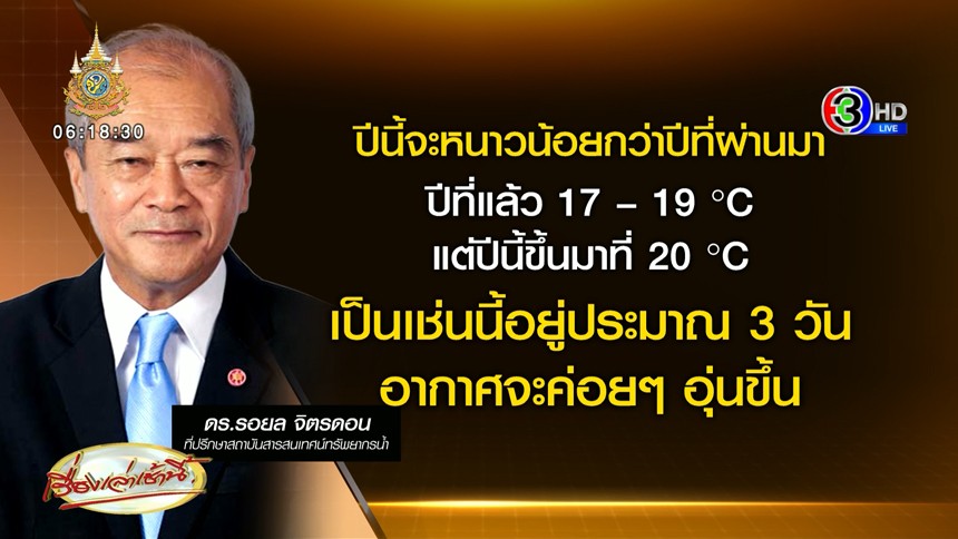 “ปีนี้ จะหนาวน้อยกว่าปีที่ผ่านมา ปีที่แล้วอุณหภูมิจะอยู่ที่ 17-19 องศาเซลเซียส แต่ปีนี้ อุณหภูมิสูงขึ้นมาที่ 20 องศาเซลเซียส เป็นเช่นนี้อยู่ประมาณ 3 วัน หลังจากนั้นอากาศก็จะค่อยๆอุ่นขึ้น เพราะปีนี้ลมมรสุมตะวันตกเฉียงใต้จะพัดมาตลอดไม่ค่อยขาดสาย” ดร.รอยล กล่าว