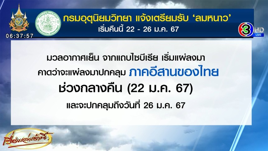 กรมอุตุนิยมวิทยา แจ้งเตรียมรับลมหนาว เริ่มที่อีสาน คืนวันที่ 22-26 ม.ค. ส่วนภาคกลาง-กทม. มีฝนฟ้าคะนองช่วงแรก