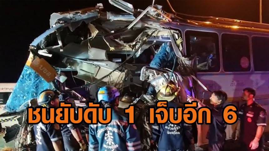 บรรทุกพ่วง 18 ล้อ ไม่เห็นรถทัวร์ ยูเทิร์นชนเต็มแรง พนง.สาวประจำรถดับคาที่ เจ็บอีก 6 ราย