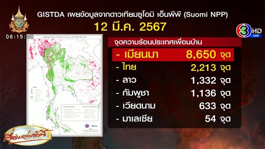 ทางด้าน GISTDA วานนี้ ( 12 มี.ค.) เผยข้อมูลจากดาวเทียมซูโอมิ เอ็นพีพี (Suomi NPP) และจากดาวเทียมอีกหลายดวง ไทยพบจุดความร้อนทั้งประเทศ 2,213 จุด ซึ่งข้อมูลจากดาวเทียมยังระบุอีกว่าจุดความร้อนที่พบส่วนใหญ่เกิดขึ้นในพื้นที่ป่าอนุรักษ์ 1,112 จุด ตามด้วยพื้นที่ป่าสงวนแห่งชาติ 789 จุด พื้นที่เกษตร 160 จุด พื้นที่เขต สปก. 91 จุด แหล่งชุมชนและอื่นๆ 54 จุด และพื้นที่ริมทางหลวง 7 จุด สำหรับจังหวัดที่พบจำนวนจุดความร้อนสูงสุด 3 อันดับแรก ได้แก่ แม่ฮ่องสอน 674 จุด เชียงใหม่ 395 จุด ตาก 218 จุด