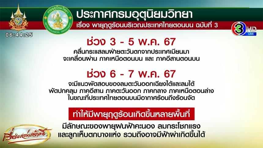 ในช่วงวันที่ 3–5 พ.ค. 67 คลื่นกระแสลมฝ่ายตะวันตกจากประเทศเมียนมาจะเคลื่อนผ่านภาคเหนือตอนบนและภาคตะวันออกเฉียงเหนือตอนบน ส่วนในช่วงวันที่ 6-7 พ.ค.67 จะมีแนวพัดสอบของลมตะวันออกเฉียงใต้และลมใต้พัดปกคลุมบริเวณภาคตะวันออกเฉียงเหนือ ภาคตะวันออก ภาคกลาง และภาคเหนือตอนล่าง