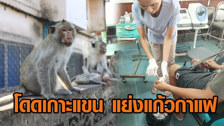 เกเรไม่เลิก! ลิงลพบุรีโดดเกาะแขน แย่งแก้วกาแฟ กัดมือจนเลือดสาด