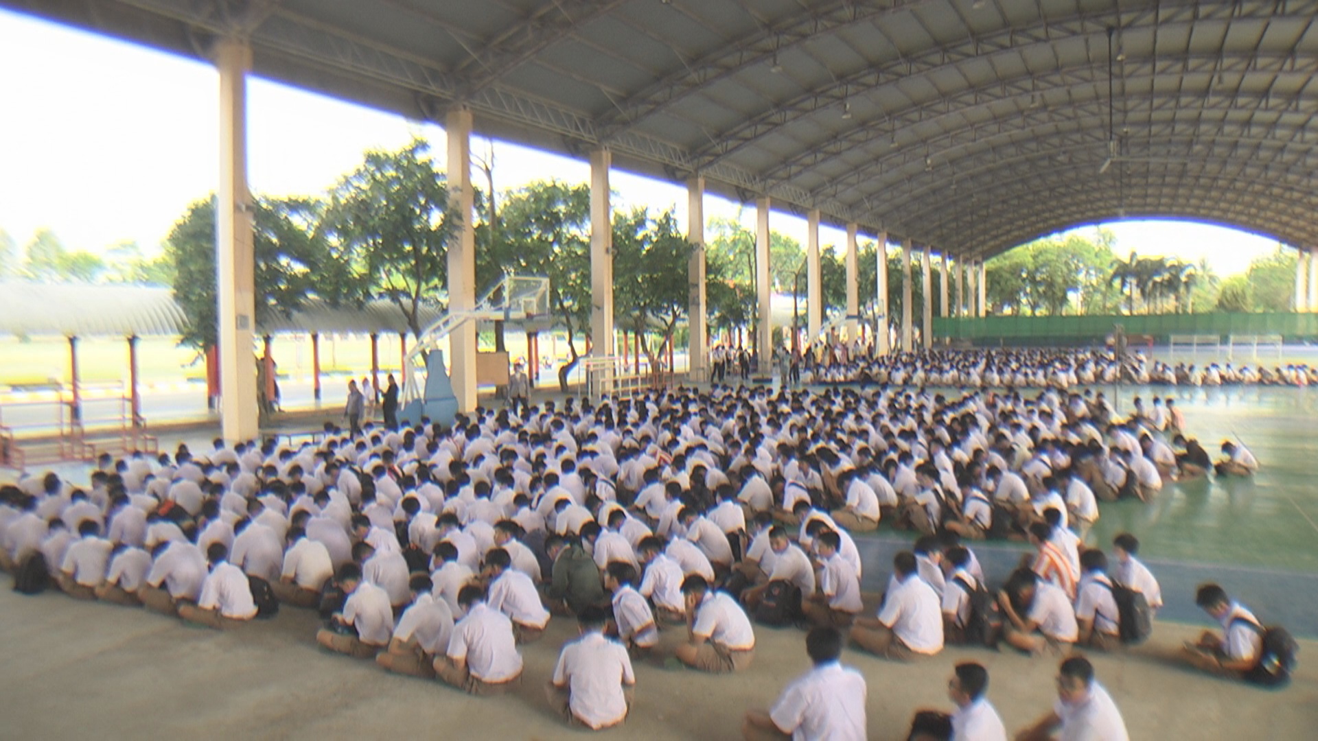 ทางโรงเรียนได้กำหนดให้เด็กนักเรียน ม.1 และ ม.2 ไปเข้าแถวทุกเช้าที่อาคารธรรมสถาน เด็กนักเรียน ม.3 และ ม.4 ไปเข้าที่โดมอาคาร 111 ปี และเด็กนักเรียน ม.5 และ ม.6 ไปเข้าที่แถวบริเวณอาคารโรงอาหาร ซึ่งแต่ละอาคารมีหลังคากันแดดกันฝนอย่างมั่นคงแข็งแรง
