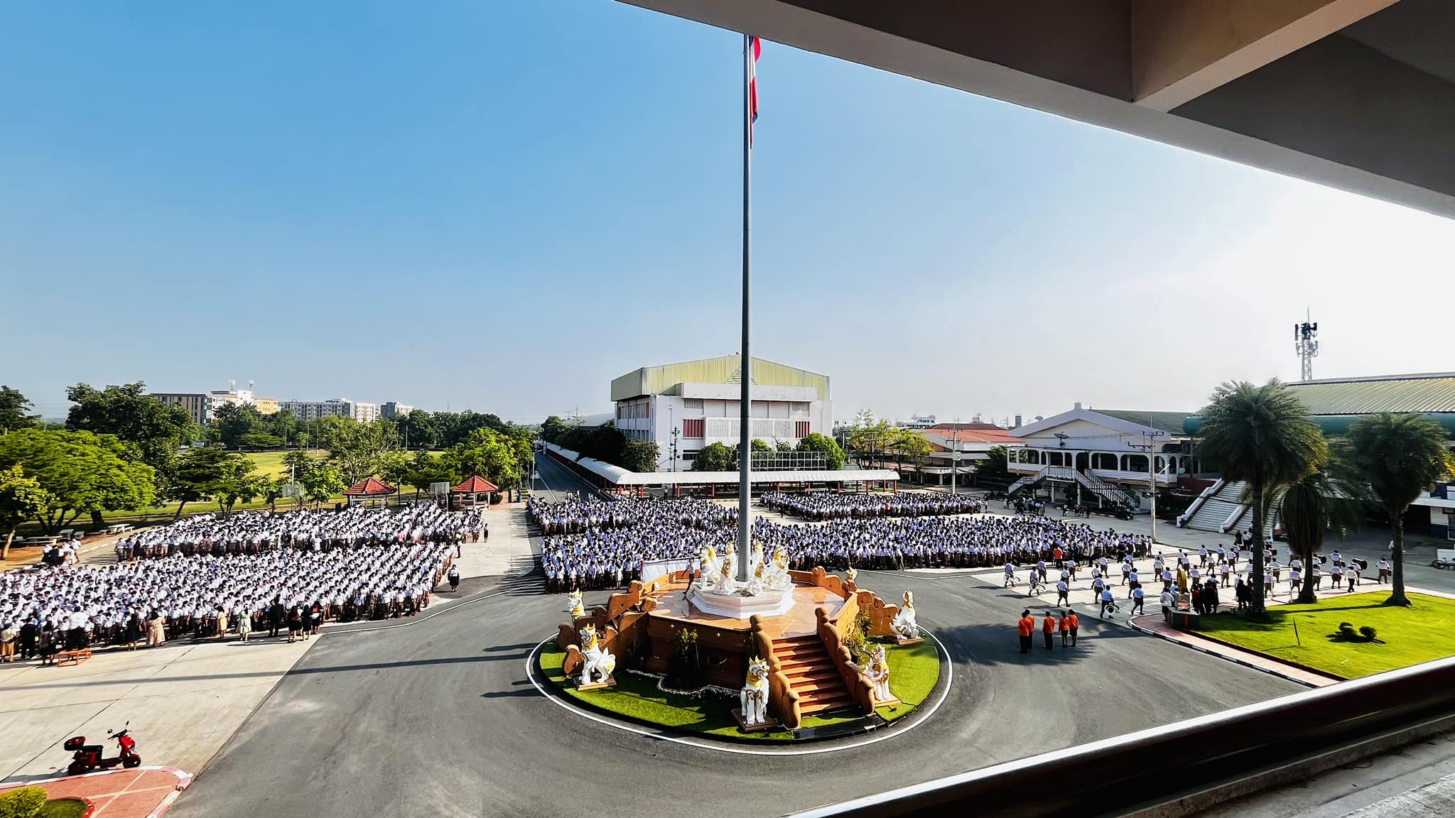 โดยในวันต่อมา เด็กนักเรียนทุกระดับชั้นจะไปเข้าแถวภายในอาคารสถานที่ต่าง ๆ ที่โรงเรียนได้จัดเตรียมเอาไว้ เพราะทราบดีว่าทุกวันนี้อากาศร้อน และที่สำคัญบริเวณอาคารโดมใหญ่ของโรงเรียนไม่ได้อยู่ใกล้เสาธง ยังไม่มีเครื่องขยายเสียง จึงต้องมีการติดตั้งเครื่องขยายเสียง เพื่อให้เด็กนักเรียนได้รับฟังข่าวสารจากครูในแต่ละวันอย่างชัดเจน