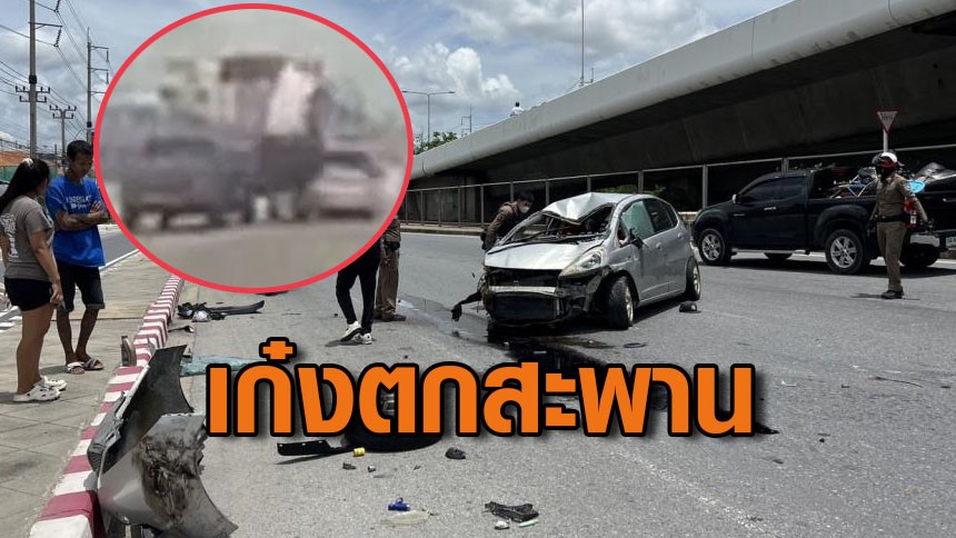 เก๋งเฉี่ยวกระบะ เสียหลักพลิกคว่ำตกสะพานสูง 6 เมตร