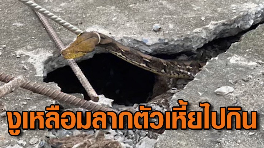 งูเหลือมลากตัวเงินตัวทองลงไปเป็นอาหารใต้พื้นปูนหอพัก เจ้าหน้าที่กู้ภัยใช้ค้อนทุบพื้นลากนานนับชั่วโมง
