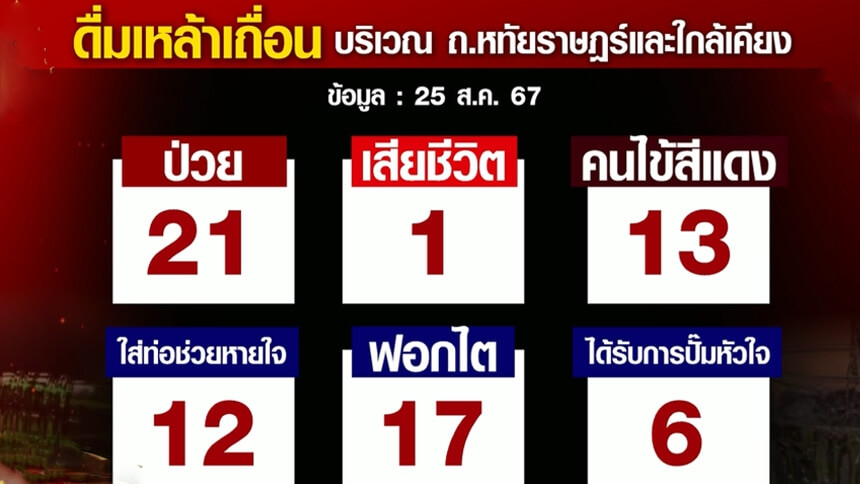 นพ.เกรียงไกร นามไธสง ผู้อำนวยการโรงพยาบาลนพรัตนราชธานี ซึ่งเป็นศูนย์ปฏิบัติการวางแนวทางรักษาผู้ป่วยจากการดื่มสุราเถื่อน ระบุว่า ล่าสุด มีผู้ป่วยได้รับสารพิษเมทานอล เข้ารับการรักษา จำนวน 21 ราย ในจำนวนนี้เสียชีวิตไปแล้ว 1 ราย ที่ รพ.สินแพทย์ เสรีรักษ์ และมีผู้ป่วยที่อาการหนัก น่าจะเสียชีวิตในไม่ช้านี้อีก 1 ราย นอกจากนี้ ในจำนวนผู้ป่วยที่ยังรักษาอยู่ 20 คน พบว่าเป็นผู้ป่วยสีแดง อาการรุนแรงประมาณ 15-16 คน ต้องอยู่ในห้องไอซียู โดยใส่เครื่องช่วยหายใจ 2 คน ต้องฟอกไต 17 คน