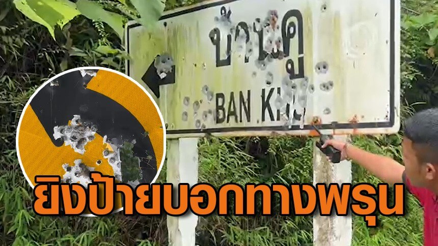 จุดลองปืน ยิงป้ายบอกทางพรุน พบรูกระสุนและเศษหัวตะกั่วยังติดอยู่ที่ป้าย เกือบ 100 นัด ชาวบ้านบอกได้ยินเสียงปืนจนชิน ลั่นไม่เห็นเจ้าหน้าที่ทำอะไรได้