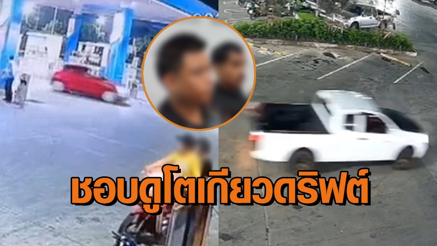 รวบสองหนุ่มดริฟต์รถในปั๊มน้ำมัน สารภาพชอบดูโตเกียวดริฟต์เลยอยากลอง