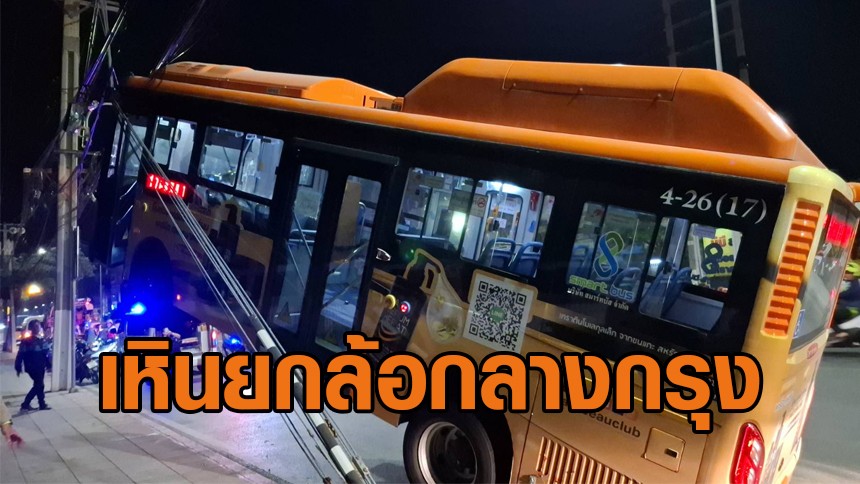รถเมล์สาย 167 ยกล้อ ห้อยกับสลิงยึดเสาไฟฟ้าแรงสูง เคราะห์ดี 5 ชีวิตปลอดภัย