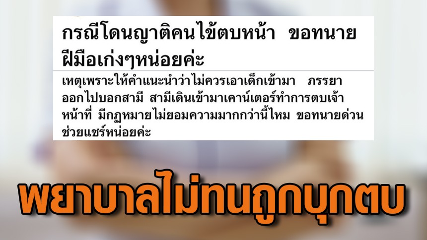 ขณะที่ผู้ใช้เฟซบุ๊กรายหนึ่ง โพสต์ว่า เหตุที่เกิดขึ้น เพราะพยาบาลให้คำแนะนำว่า ไม่ควรเอาเด็กเข้ามา ภรรยาออกไปบอกสามี สามีเดินเข้ามาเคาน์เตอร์ ทำการตบเจ้าหน้าที่ มีกฎหมายไม่ยอมความมากกว่านี้ไหม ขอทนายด่วน ช่วยแชร์หน่อยค่ำ