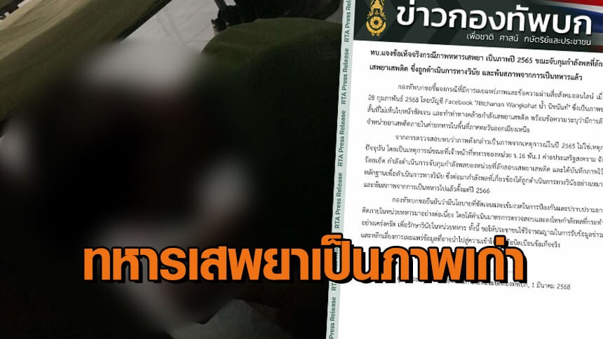 ทบ.แจงข้อเท็จจริงกรณีภาพทหารเสพยา เป็นภาพปี 2565 ขณะจับกุมกำลังพลที่ลักลอบเสพยาเสพติด ซึ่งถูกดำเนินการทางวินัย และพ้นสภาพจากการเป็นทหารแล้ว