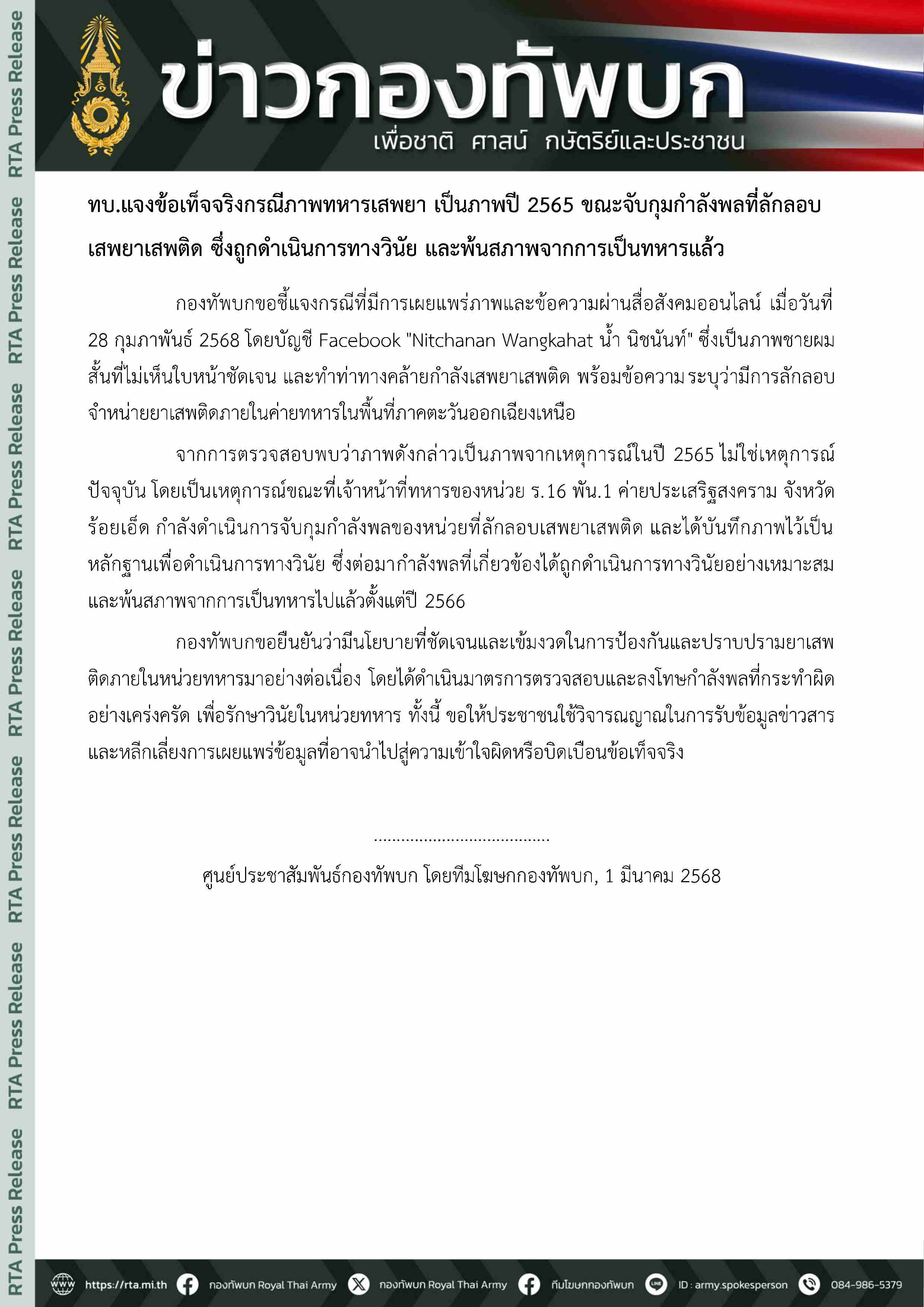 กองทัพบกขอชี้แจงกรณีที่มีการเผยแพร่ภาพและข้อความผ่านสื่อสังคมออนไลน์ เมื่อวันที่ 28 กุมภาพันธ์ 2568 โดยบัญชี Facebook “Nitchanan Wangkahat น้ำ นิชนันท์” ซึ่งเป็นภาพชายผมสั้นที่ไม่เห็นใบหน้าชัดเจน และทำท่าทางคล้ายกำลังเสพยาเสพติด พร้อมข้อความระบุว่ามีการลักลอบจำหน่ายยาเสพติดภายในค่ายทหารในพื้นที่ภาคตะวันออกเฉียงเหนือ