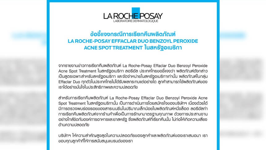 จากกรณีข่าวการเรียกคืนผลิตภัณฑ์ La Roche-Posay Effaclar Duo Benzoyl Peroxide Acne Spot Treatment ในสหรัฐอเมริกานั้น ล่าสุด บริษัท ลอรีอัล ประเทศไทย ออกเอกสารชี้แจงว่า