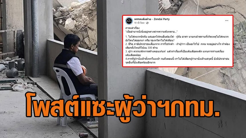 ชัชชาติ บัญชาการค้นหาผู้สูญหาย ตึก สตง.ถล่ม วันที่ 5 พบแล้ว 15 ศพ ญาติยังมีความหวัง โซเชียลแชร์ภาพ ชัชชาตินั่งเฝ้ารอด้วยความหวัง เจ้าตัวเผยนั่งกินข้าวไข่เจียว ขอให้คนที่ติดภายในอาคารอดทนอีกหน่อย หวังให้เจอตัวและได้ช่วยชีวิต ด้านพรรคเส้นด้าย โพสต์แซะ บอกเมื่ออำนาจนั่งนิ่งอยู่กลางซากความพังทลาย