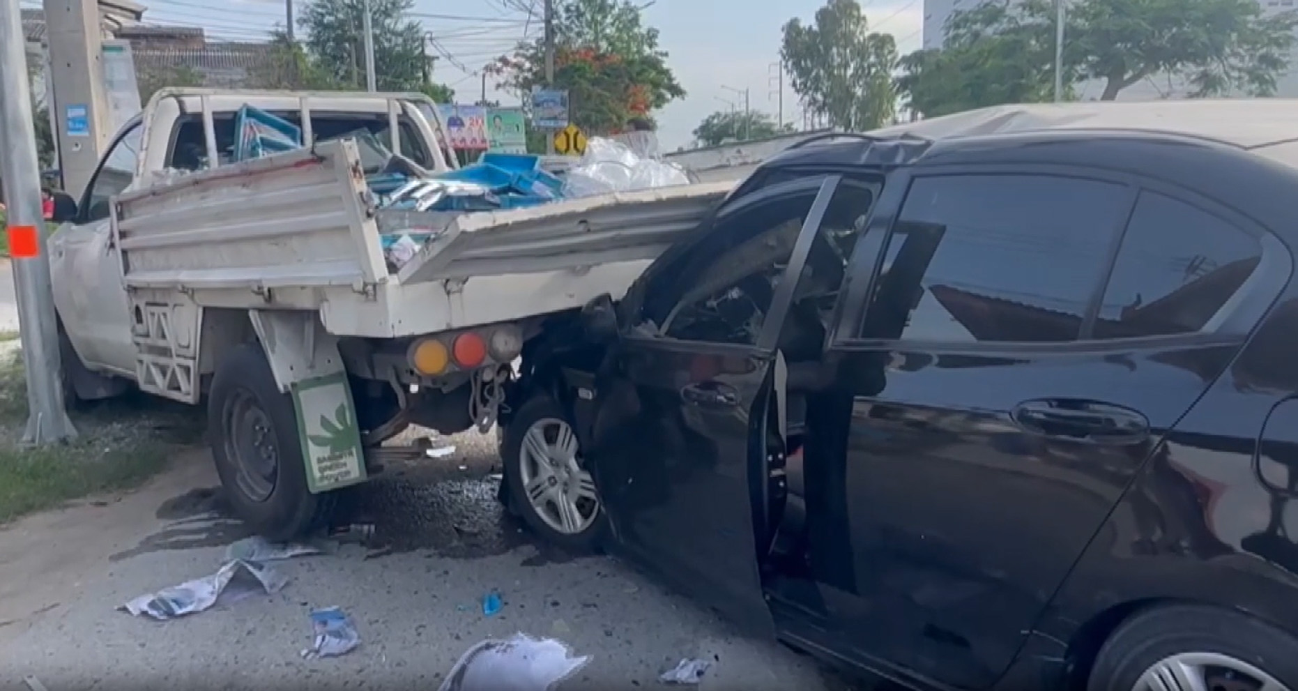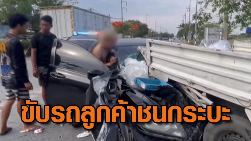 ช่างขับรถลูกค้าไปธุระ หลับในพุ่งชนท้ายรถกระบะพังยับ เจ็บ 2