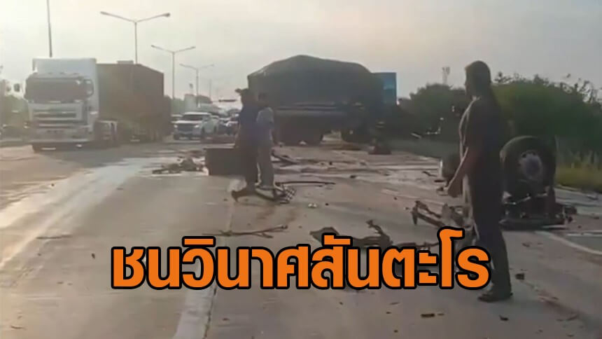 ใหญ่ชนใหญ่! รถพ่วงพุ่งชนรถเทรลเลอร์ ก่อนข้ามเลนอัดรถบรรทุก พังวินาศสันตะโร