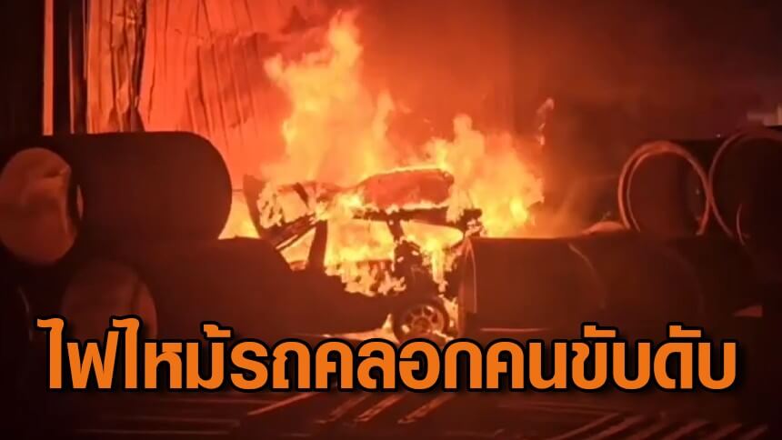 เก๋งหลุดโค้งพุ่งชนท่อระบายน้ำคอนกรีต ก่อนเหินชนป้าย ทำไฟคลอกคนขับดับคารถ