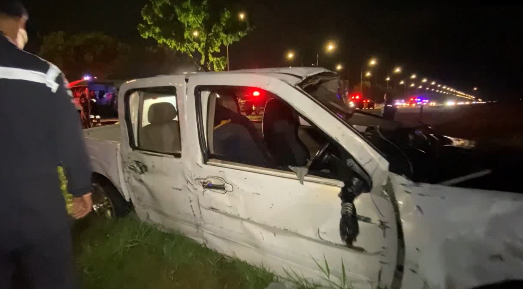 ที่บริเวณลานหญ้าโล่งข้างทาง พบรถยนต์กระบะสีขาว กรุงเทพมหานคร สภาพด้านหน้าพังยับเยิน โดยมีร่างของชายคนขับ เป็นชายอายุ 18 ปี เสียชีวิตคาพวงมาลัย ขณะที่จากการตรวจสอบข้างรถยังพบร่างของ ชายอายุ 22 ปี นอนเสียชีวิตอยู่กับพื้น นอกจากนั้นยังไปพบ หญิงอายุ 18 ปี ซึ่งนั่งมาในเบาะหน้าฝั่งซ้ายได้รับบาดเจ็บและยังพอให้การได้ เจ้าหน้าทีจึงช่วยปฐมพยาบาลเบื้องต้นและนำตัวส่งโรงพยาบาล