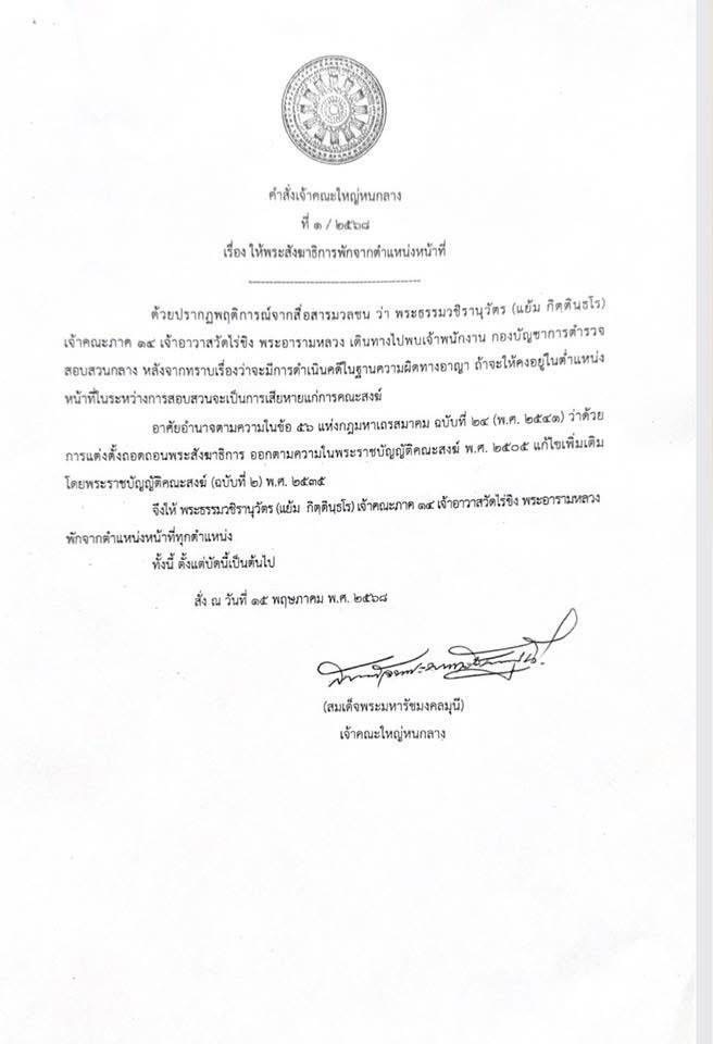 จึงได้อาศัยอำนาจตามความในข้อ 56 แห่งกฎมหาเถรสมาคม ฉบับที่ 24 (พ.ศ. 2553) ว่าด้วยการแต่งตั้งถอดถอนพระสังมาธิการ ออกตามความในพระราชบัญญัติคุณะสูงณ์ พ.ศ. 2505 แก้ไขเพิ่มเดิมโดยพระราชบัญญัติคณะสงน์ (ฉบับที่ 2) พ.ศ. 2535 ให้เหตุผลว่า ถ้าจะให้คงอยู่ในตำแหน่งหน้าที่ในระหว่างการสอบสวนจะเป็นการเสียหายแก่การคณะสงฆ์