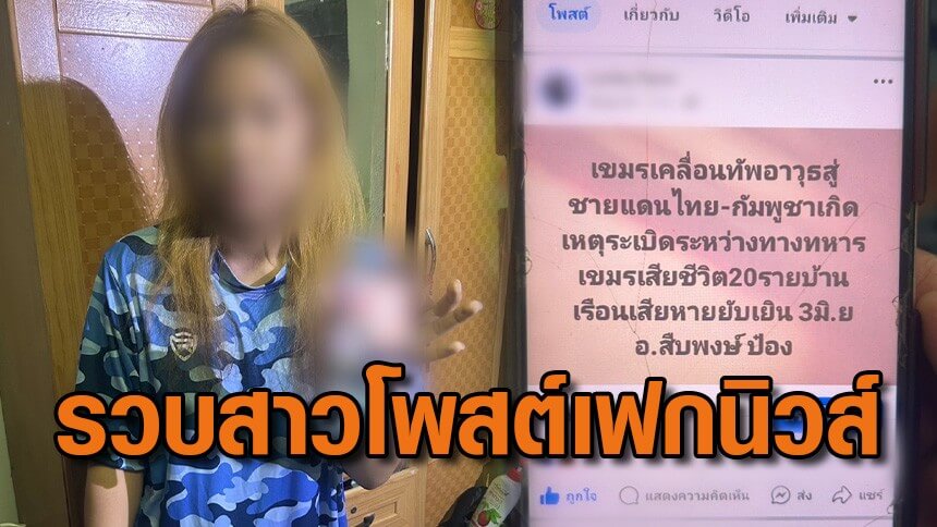 รวบสาวโพสต์เฟกนิวส์ใส่ไฟกรณีพิพาทไทย-กัมพูชา สร้างความเข้าใจผิด