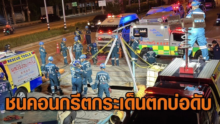 จักรยานยนต์ฝ่าแนวกั้นก่อสร้างบ่อร้อยสายไฟใต้ดิน พุ่งชนคอนกรีต ร่างกระเด็นตกบ่อจมน้ำดับ