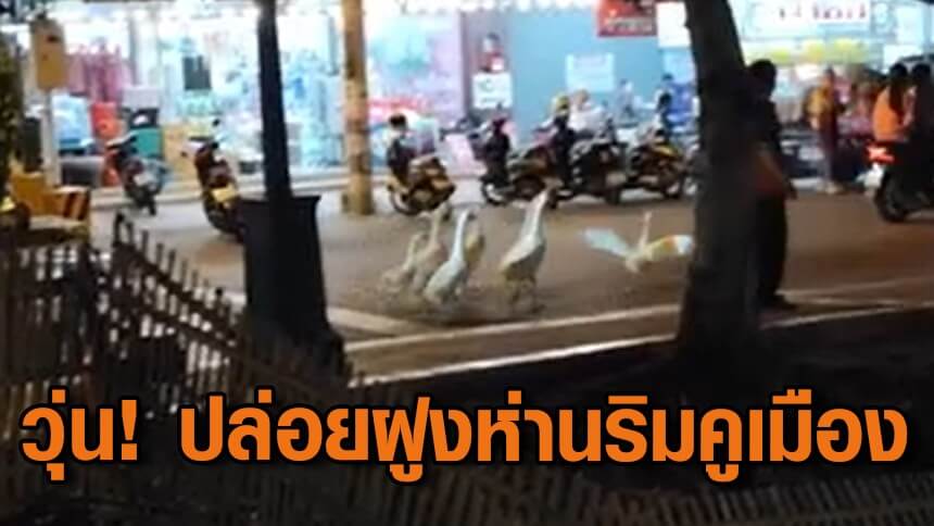 คืนแรกก็วุ่นแล้ว! ทดลองเลี้ยงห่าน 10 ตัว หวังกำจัดจอกแหนคูเมือง เจอวิ่งพล่านเต็มถนนหวิดเกิดอุบัติเหตุ