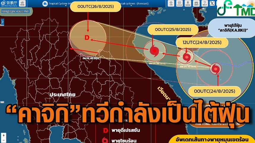 เมื่อเวลา 4.00 น. ของวันนี้ (25 ส.ค. 68) พายุไต้ฝุ่น “คาจิกิ” บริเวณทะเลจีนใต้ตอนบน มีศูนย์กลางอยู่ห่างประมาณ 200 กิโลเมตร ทางทิศตะวันออกเฉียงใต้ของเมืองวิญ ประเทศเวียดนาม หรือที่ละติจูด 18.3 องศาเหนือ ลองจิจูด 107.6 องศาตะวันออก ความเร็วลมสูงสุดใกล้ศูนย์กลางประมาณ 150 กิโลเมตรต่อชั่วโมง พายุนี้กำลังเคลื่อนตัวทางทิศตะวันตกค่อนทางเหนือเล็กน้อย ด้วยความเร็วประมาณ 20 กิโลเมตรต่อชั่วโมง คาดว่าจะเคลื่อนขึ้นฝั่งบริเวณเมืองวิญ ประเทศเวียดนามตอนบน และจะอ่อนกำลังลงเป็นพายุโซนร้อน ในวันที่ 25 ส.ค. 68 หลังจากนั้นจะอ่อนกำลังลงเป็นพายุดีเปรสชัน เคลื่อนเข้าสู่ประเทศลาว ในช่วงเช้าวันที่ 26 ส.ค. 68 พายุนี้มีแนวโน้มที่จะอ่อนกำลังลงเป็นหย่อมความกดอากาศต่ำกำลังแรงและเคลื่อนเข้าสู่ประเทศไทยบริเวณจังหวัดน่าน ในช่วงเย็นของวันที่ 26 ส.ค. 68