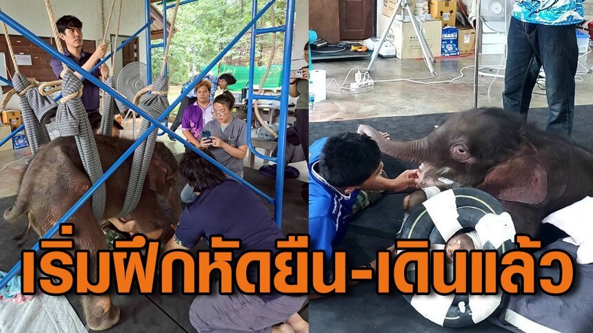 ทีมสัตวแพทย์เร่งฟื้นฟู “ข้าวต้ม” ลูกช้างป่าพลัดหลง เริ่มฝึกหัดให้ยืนและเดินแล้ว