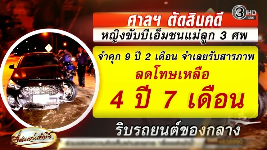 วานนี้ (5 พ.ย.) ศาลจังหวัดชุมพร นัดฟังคำพิพากษาคดีที่หญิงวัย 30 ปี ขับรถบีเอ็มฯ ชน 3 ศพ โดยศาลพิพากษาจำคุก 9 ปี 2 เดือน แต่จำเลยรับสารภาพ จึงลดโทษเหลือ 4 ปี 7 เดือน โทษจำคุกไม่รอลงอาญา ปรับ 500 บาท พร้อมริบรถยนต์ของกลาง