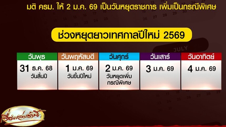 หยุดยาว 5 วัน! ครม.ไฟเขียว ให้ 2 ม.ค.69 เป็นวันหยุดราชการ เพิ่มเป็นกรณีพิเศษ