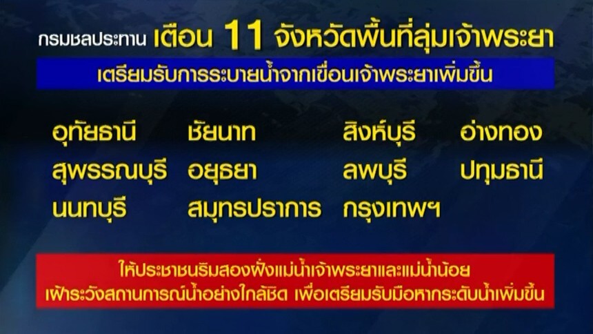 กรมป้องกันและบรรเทาสาธารณภัย (ปภ.) ประสาน 11 จังหวัด ได้แก่ อุทัยธานี ชัยนาท สิงห์บุรี อ่างทอง สุพรรณบุรี พระนครศรีอยุธยา ลพบุรี ปทุมธานี นนทบุรี และสมุทรปราการ รวมถึงกรุงเทพฯ เฝ้าระวังสถานการณ์ระดับน้ำในแม่น้ำเจ้าพระยาเพิ่มสูงขึ้น