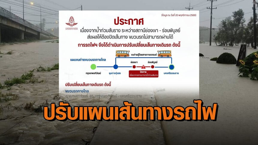 การรถไฟแห่งประเทศไทย ประกาศปิดเส้นทางรถไฟ ช่วงสถานีช่องเขา – สถานีร่อนพิบูลย์ เหตุน้ำท่วมทางรถไฟ จำเป็นต้องปรับแผนการเดินรถ จำนวน 6 ขบวน