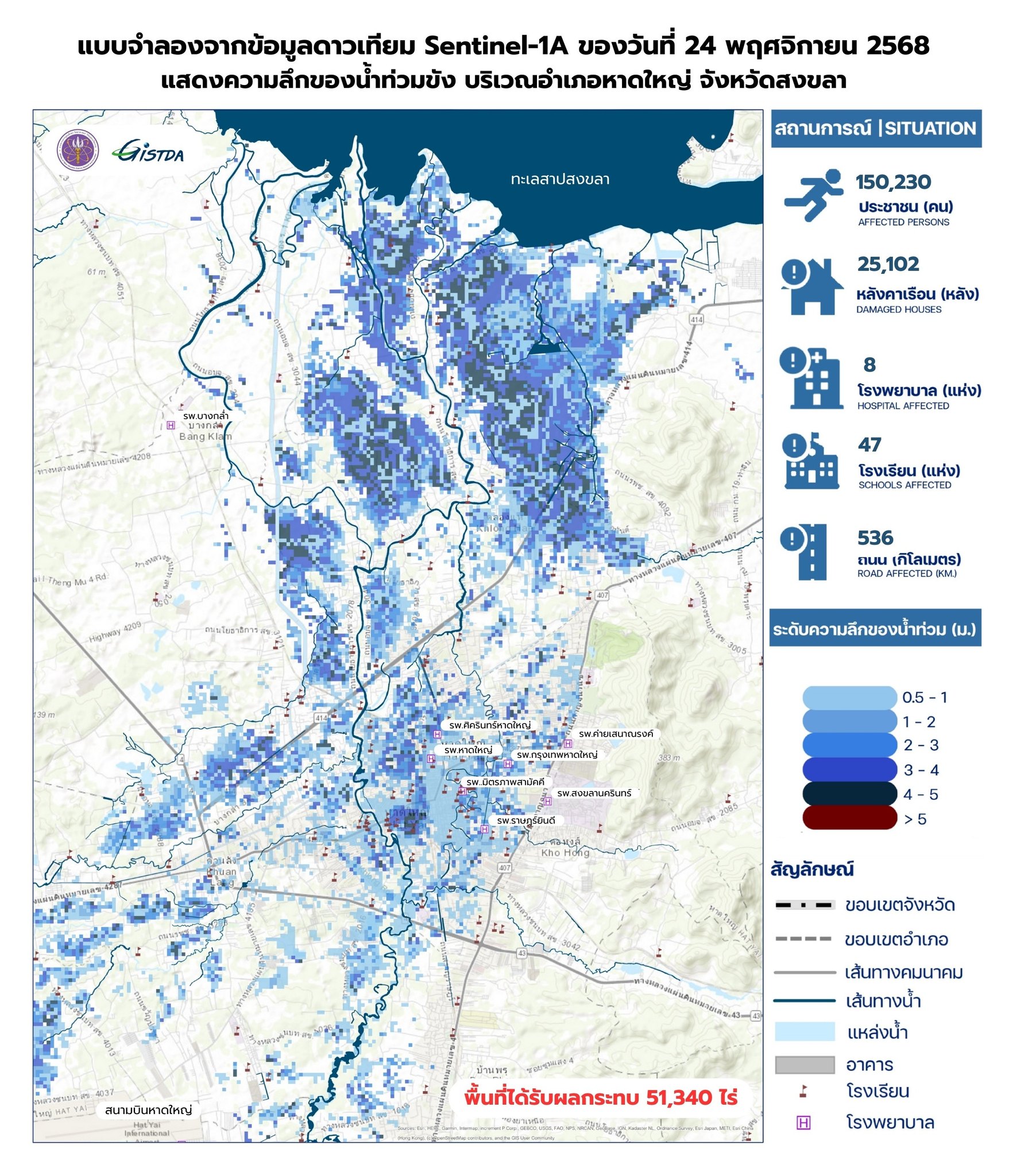 วันที่ 25 พ.ย.2568 GISTDA เผยแพร่ผลวิเคราะห์สถานการณ์น้ำท่วมขังในพื้นที่อำเภอหาดใหญ่ จังหวัดสงขลา โดยใช้เทคนิค HAND Model (Height Above Nearest Drainage) ร่วมกับข้อมูลจากดาวเทียม Sentinel-1A ของวันที่ 24 พฤศจิกายน 2568 ในการประเมินความลึกของน้ำ เพื่อสนับสนุนหน่วยงานที่เกี่ยวข้องในการปฏิบัติการช่วยเหลือประชาชน