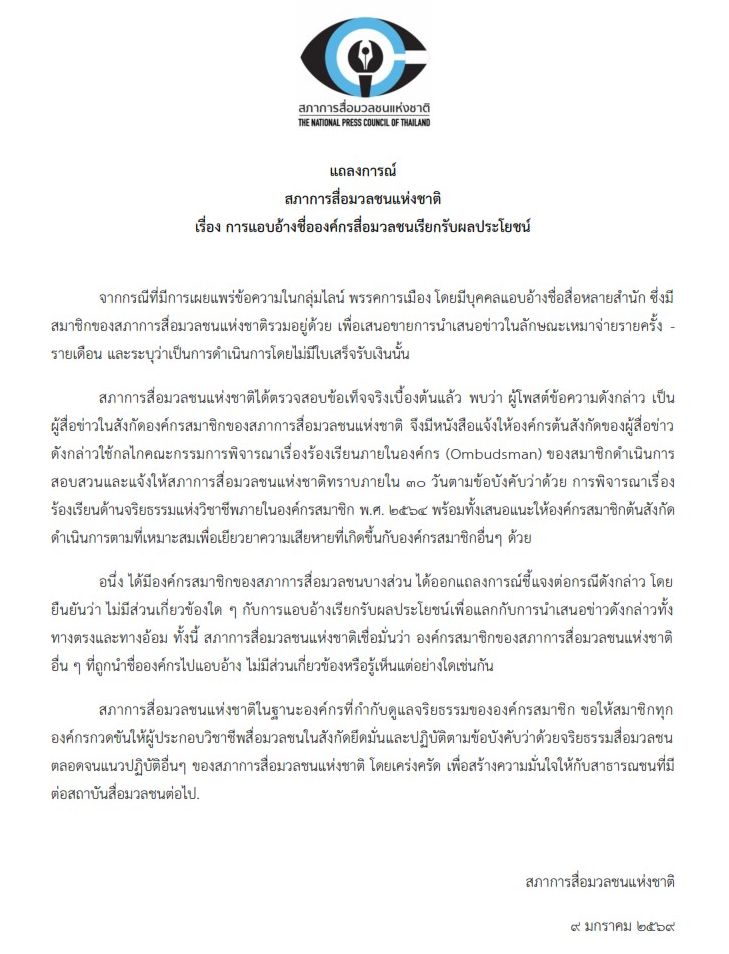 เมื่อวันที่ 9 ม.ค.2568 สภาการสื่อมวลชนแห่งชาติ ออกแถลงการณ์ จากกรณีที่มีการเผยแพร่ข้อความในกลุ่มไลน์ พรรคการเมือง โดยมีบุคคลแอบอ้างชื่อสื่อหลายสำนัก ซึ่งมีสมาชิกของสภาการสื่อมวลชนแห่งชาติรวมอยู่ด้วย เพื่อเสนอขายการนำเสนอข่าวในลักษณะเหมาจ่ายรายครั้ง – รายเดือน และระบุว่าเป็นการดำเนินการโดยไม่มีใบเสร็จรับเงินนั้น