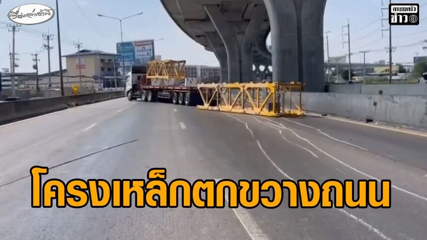 โครงเหล็กขาเครนหล่นจากท้ายบรรทุก 22 ล้อ ขวางถนนพระราม 2 คนขับอ้างสเตย์รัดขาด