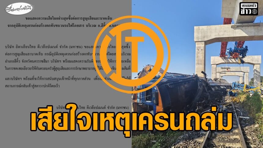 “อิตาเลียนไทย” ออกแถลงการณ์ แสดงความเสียใจเหตุเครนก่อสร้างถล่มทับรถไฟ พร้อมรับผิดชอบช่วยเหลือ ชดเชยเยียวยาเหยื่อเต็มที่ และสนับสนุนหน่วยงานแก้ไขให้สถานการณ์กลับสู่สภาวะปกติ
