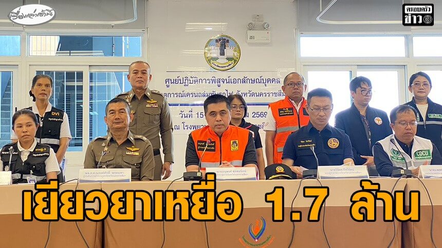 วันนี้(18 ม.ค. 69) นายอนุพงศ์ สุขสมนิตย์ ผู้ว่าราชการจังหวัดนครราชสีมา พร้อมด้วย นายวิจิตร กิจวิรัตน์ รองผู้ว่าราชการจังหวัดนครราชสีมา นําเจ้าหน้าที่ที่เกี่ยวข้องร่วมกันแถลงข่าวปิดศูนย์ปฏิบัติการพิสูจน์เอกลักษณ์บุคคลเหตุการณ์เครนถล่มทับรถไฟ จ.นครราชสีมา ณ โรงพยาบาลมหาราชนครราชสีมา