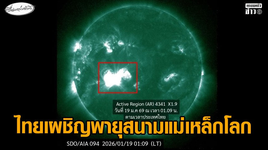 เมื่อวันที่ 19 มกราคม 2569 ณ เวลา 01.09 น. ตามเวลาประเทศไทยได้เกิดการปะทุของ Solar Flare จากบริเวณ Active Region (AR) 4341 ตามรูปที่ 1 การปะทุครั้งนี้ไม่เพียงปลดปล่อยพลังงานรังสีในช่วงคลื่นต่าง ๆ ออกมาเท่านั้น แต่ยังเกิดการปลดปล่อยสสารร้อน (Plasma) และสนามแม่เหล็กออกจากดวงอาทิตย์ในรูปแบบของ Coronal Mass Ejection (CME) มีทิศทางพุ่งตรงมายังโลก ประกอบกับหลุมโคโรนา (Coronal hole) ที่ปล่อยลมสุริยะมาจากดวงอาทิตย์ ตามรูปที่ 2-4 ทำให้เกิดสนามแม่เหล็กโลกรุนแรง จากข้อมูลจากอวกาศและข้อมูลจากเครื่องวัดสนามแม่เหล็กโลก พบว่าไทยเผชิญพายุสนามแม่เหล็กโลกระดับ G4 (Severe Geomagnetic Storm)
