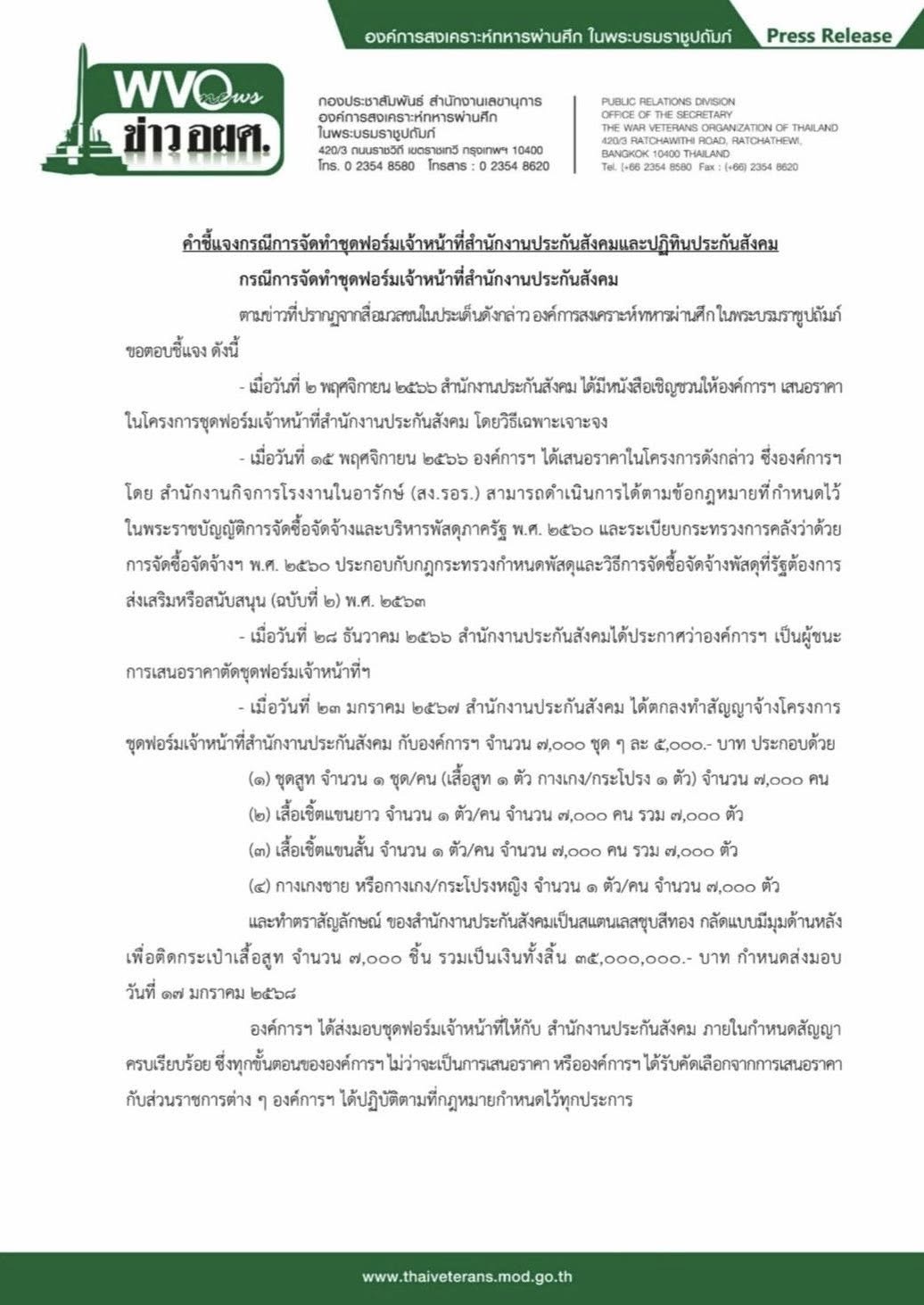 เมื่อวันที่ 29 มกราคม 2569 องค์การสงเคราะห์ทหารผ่านศึก (อผศ.) เปิดเอกสารชี้แจงกรณีการจัดทำชุดฟอร์มเจ้าหน้าที่สำนักงานประกันสังคม ตามข่าวที่ปรากฏจากสื่อมวลชนในประเด็นดังกล่าว องค์การสงเคราะห์ทหารผ่านศึก ในพระบรมราชูปถัมภ์ ขอตอบชี้แจง ดังนี้