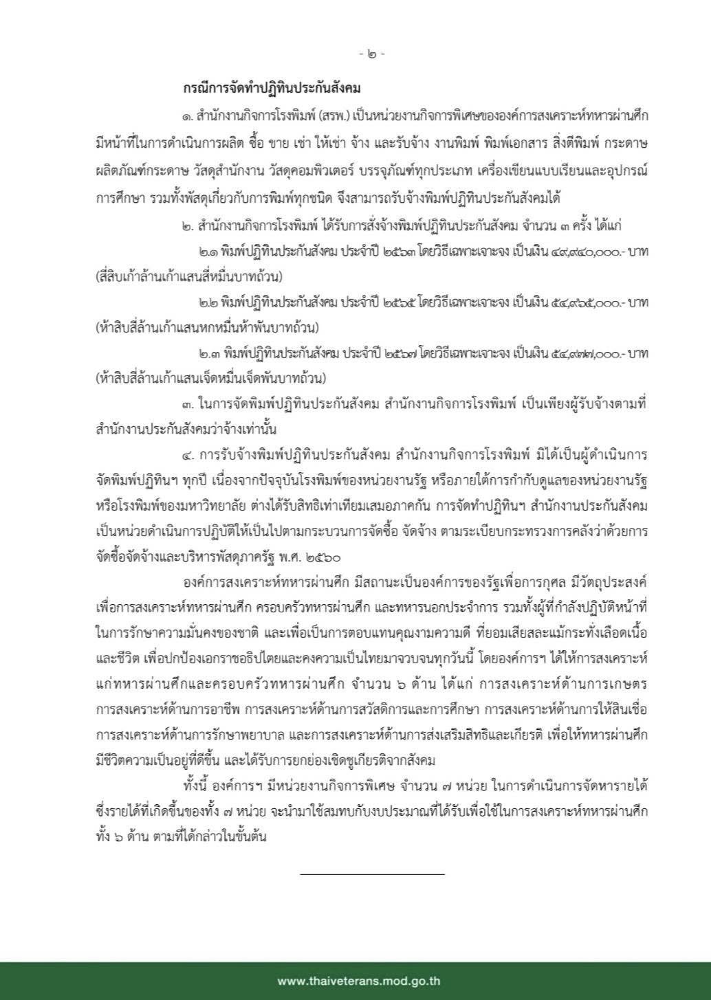 4.การรับจ้างพิมพ์ปฏิทินประกันสังคม สำนักงานกิจการโรงพิมพ์ มิได้เป็นผู้ดำเนินการจัดพิมพ์ปฏิทินฯ ทุกปี เนื่องจากปัจจุบันโรงพิมพ์ของหน่วยงานรัฐ หรือภายใต้การกำกับดูแลของหน่วยงานรัฐหรือโรงพิมพ์ของมหาวิทยาลัย ต่างได้รับสิทธิเท่าเทียมเสมอภาคกัน การจัดทำปฏิทินฯ สำนักงานประกันสังคมเป็นหน่วยดำเนินการปฏิบัติให้เป็นไปตามกระบวนการจัดซื้อ จัดจ้าง ตามระเบียบกระทรวงการคลังว่าด้วยการจัดซื้อจัดจ้างและบริหารพัสดุภาครัฐ พ.ศ.2560 องค์การสงเคราะห์ทหารผ่านศึก มีสถานะเป็นองค์การของรัฐเพื่อการกุศล มีวัตถุประสงค์เพื่อการสงเคราะห์ทหารผ่านศึก ครอบครัวทหารผ่านศึก และทหารนอกประจำการ