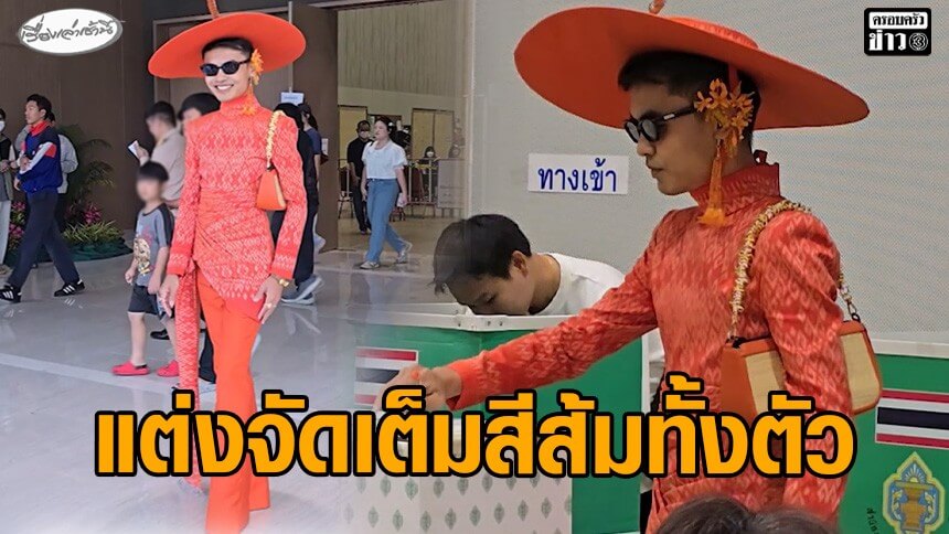ดีไซเนอร์จัดเต็มแต่งชุดผ้าไหมมัดหมี่สีส้มทั้งตัว มาเลือกตั้งล่วงหน้า เผยสีส้มคือการเปลี่ยนแปลงและความหวัง