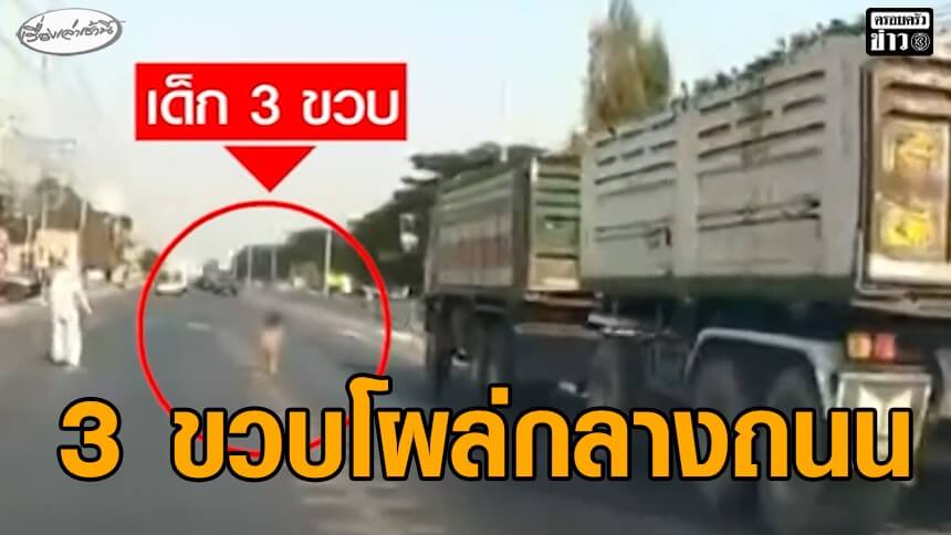 นาทีระทึก เด็ก 3 ขวบโผล่วิ่งกลางถนน ไล่จับระทึก หวิดถูกรถบรรทุกชน