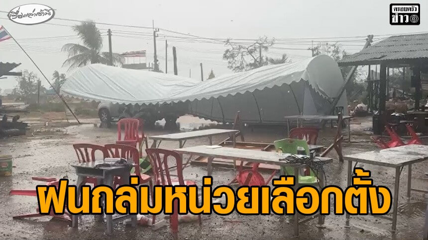 พายุฝนถล่มฉะเชิงเทรา เต็นท์ถล่มทับรถเจ้าหน้าที่ กปน. นับคะแนนไม่ได้ หอบกล่องเก็บในบ้านกำนัน