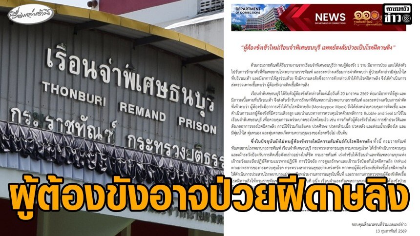เรือนจําพิเศษธนบุรี ได้รับตัวผู้ต้องขังดังกล่าวตั้งแต่เมื่อวันที่ 20 มกราคม 2569 ต่อมามีอาการไข้สูง และ มีภาวะเนื้อตายที่บริเวณเท้า จึงส่งตัวเข้ารับการรักษาที่ทัณฑสถานโรงพยาบาลราชทัณฑ์ และระหว่างเตรียมการผ่าตัด ที่เท้าพบว่า ผู้ต้องขังมีอาการเข้าได้กับโรคฝีดาษลิง (Monkeypox: Mpox) จึงได้ส่งหน่วยควบคุมการติดเชื้อ และ ดําเนินการแยกผู้ต้องขังที่มีความเสี่ยงสูง และนําแนวทางการควบคุมโรคด้วยหลักการ Bubble and Seal มาใช้ใน เรือนจําพิเศษธนบุรี เพื่อควบคุมการแพร่ระบาดของโรคโดยเร็ว เช่น การกักตัวผู้ต้องขังรับใหม่ การซักประวัติและ สังเกตอาการของโรคฝีดาษลิง การมีไข้ร่วมกับเจ็บคอ ปวดศีรษะ ปวดกล้ามเนื้อ ปวดหลัง และต่อมน้ําเหลืองโต และ มีตุ่มน้ําใส ตุ่มหนอง และตุ่มตกสะเก็ดตามความรุนแรงของโรคหรือไม่ เป็นต้น