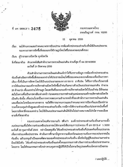การดำเนินการดังกล่าวเป็นไปตามแนวทางของกระทรวงมหาดไทย ที่กำหนดให้องค์กรปกครองส่วนท้องถิ่นสามารถประชาสัมพันธ์ภารกิจของหน่วยงานได้ เพื่อประโยชน์ของประชาชนและทางราชการ ตามหนังสือกระทรวงมหาดไทย ที่ มท 0808.2/ว 3475 ลงวันที่ 11 ตุลาคม 2550 เรื่อง ขอให้ทบทวนและกำหนดมาตรการป้องปราม กรณีองค์กรปกครองส่วนท้องถิ่นใช้เงินงบประมาณ ของทางราชการจัดซื้อสิ่งของแจกให้ราษฎรโดยใส่ชื่อของคนลงบนสิ่งของ