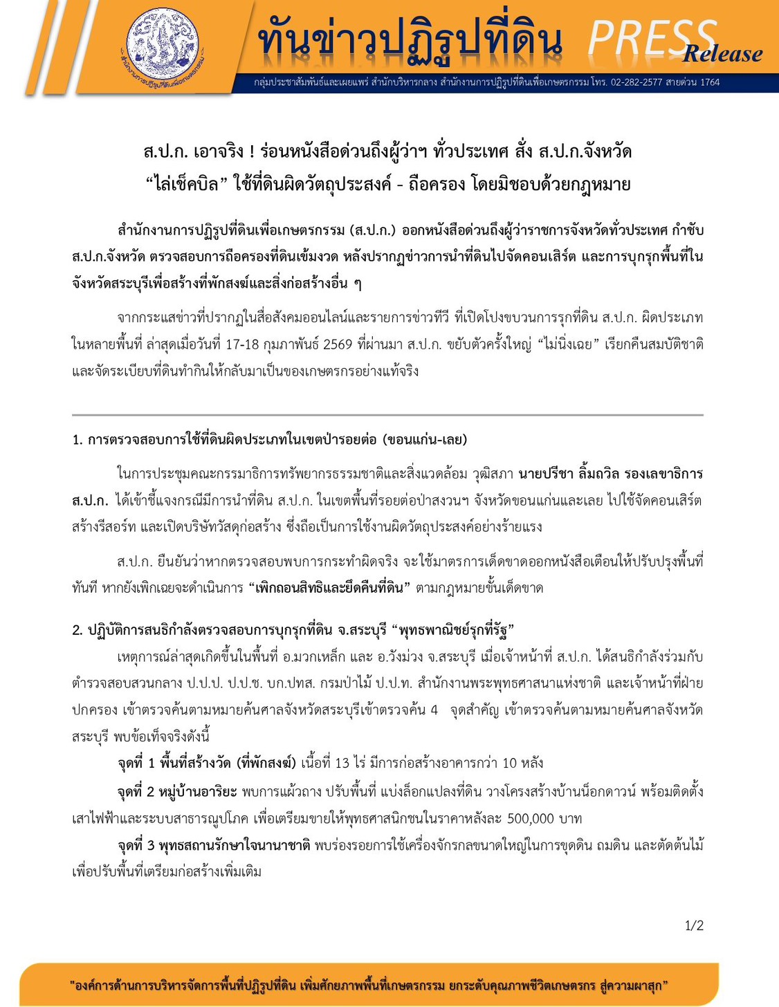 ผู้สื่อข่าวรายงานว่า สำนักงานการปฏิรูปที่ดินเพื่อเกษตรกรรม (ส.ป.ก.) ออกหนังสือด่วนถึงผู้ว่าราชการจังหวัดทั่วประเทศ กำชับ ส.ป.ก.จังหวัด ตรวจสอบการถือครองที่ดินเข้มงวด หลังปรากฏข่าวการนำที่ดินไปจัดคอนเสิร์ต และการบุกรุกพื้นที่ในจังหวัดสระบุรีเพื่อสร้างที่พักสงฆ์และสิ่งก่อสร้างอื่น ๆ