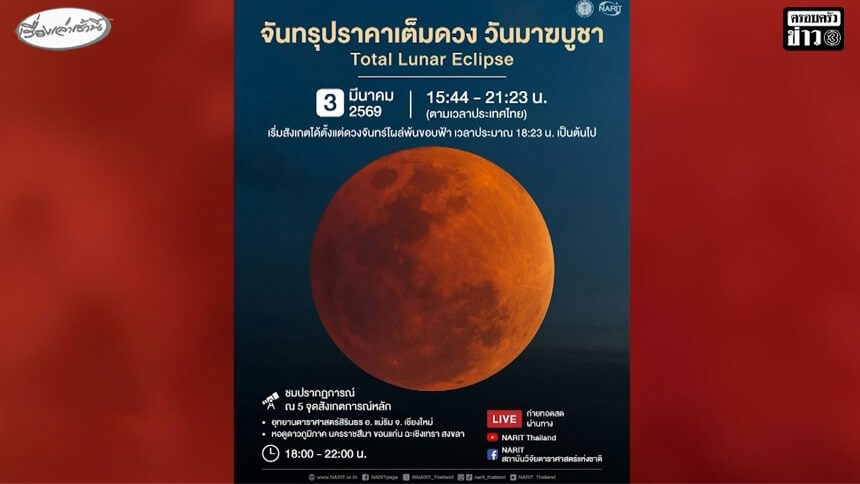 ห้ามพลาด 3 มี.ค.69 'จันทรุปราคาเต็มดวง' วันมาฆบูชา ดวงจันทร์สีแดงอิฐ